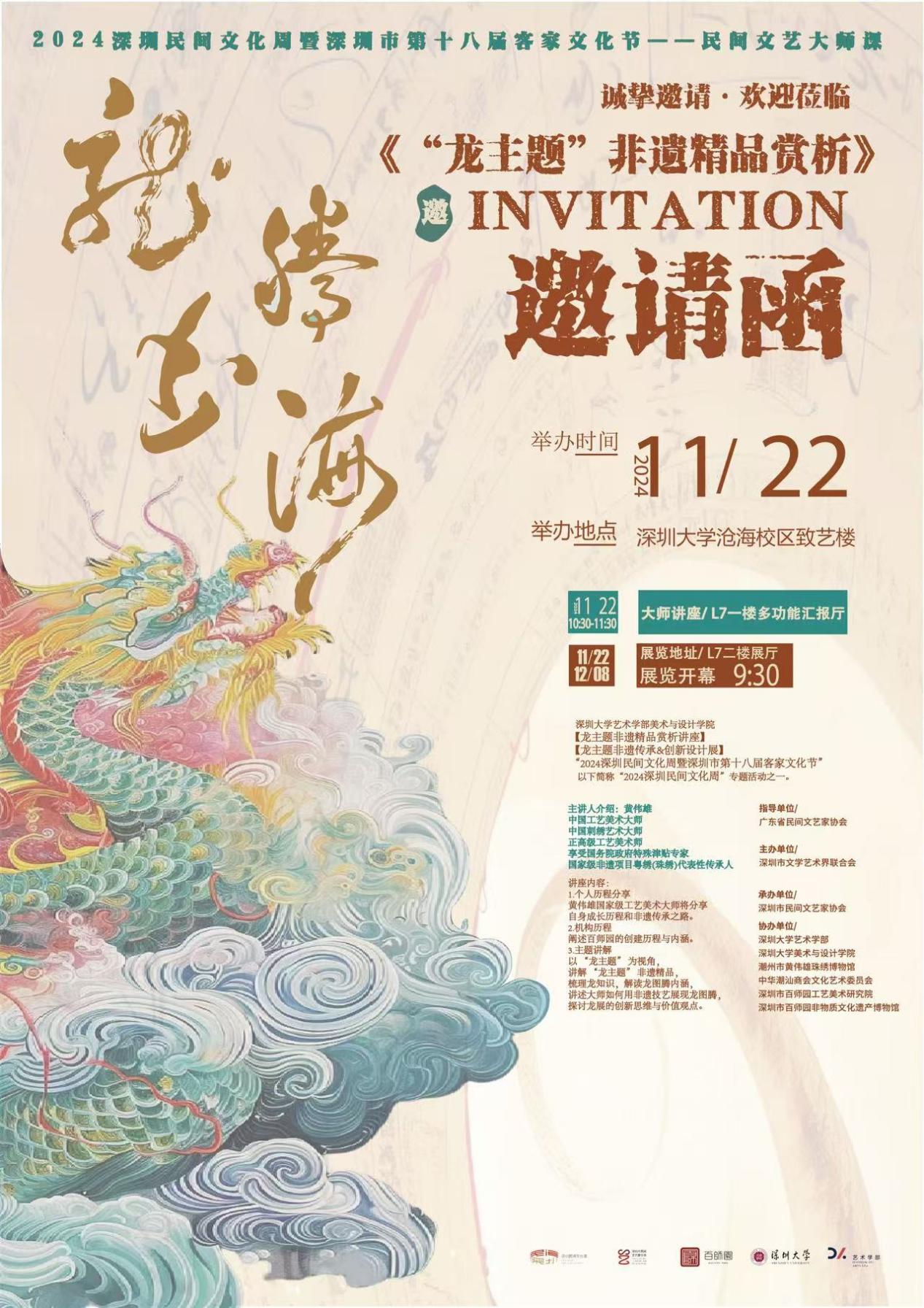 深圳大学艺术学部美术与设计学院的【龙主题非遗精品赏析讲座】和【龙主题非遗传承&创新设计展】是“2024深圳民间文化周暨深圳市第十八届客家文化节”(以下简称“2024深圳民间文化周”)专题活动之一。