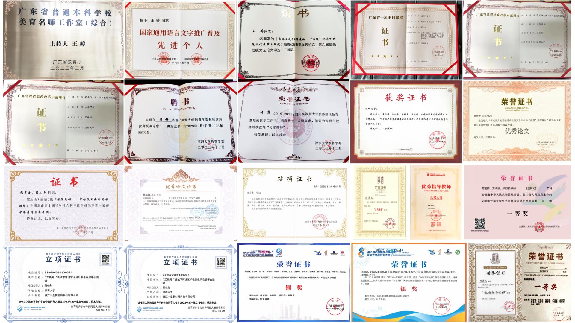 中心团队成员相继获教育部全国语言文化品牌活动优秀案例,“互联网+”大学生创新创业大赛国赛金奖和省赛银奖,全国高校数字艺术色设计大赛,全国大学生艺术展活动艺术表演一等奖,广东省研究生教育学会优秀成果奖,广东省高等学校教学管理学会年度教育教学改革优秀美育案例,广东省高校美育优秀案例,广东省大学生艺术展演活动优秀案例,粤港澳大湾区高校美术与设计作品学院奖双年展二等奖;研发设计的“礼乐弦歌”四弦琴被国家社科基金教育学重大项目“教材建设中创新性发展中华优秀传统文化研究”子课题研究成果采纳;“植物染非遗文创设计研究”入选文化与旅游部专业研究生重点研究扶持项目MFA类项目;所开设“艺术与生活”获广东省线上线下一流本科课程及省双一流课程;书法作品《滕王阁序》荣获2020年“翰墨薪传”广东省教师书法作品展软笔组一等奖;纸雕艺术获米兰设计周·中国高校设计学科师生优秀作品展全国决赛一等奖等。