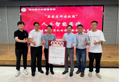 图 | 主讲人黄炳升与深圳市第二外国语学校领导老师们共同展示深圳大学录取喜报