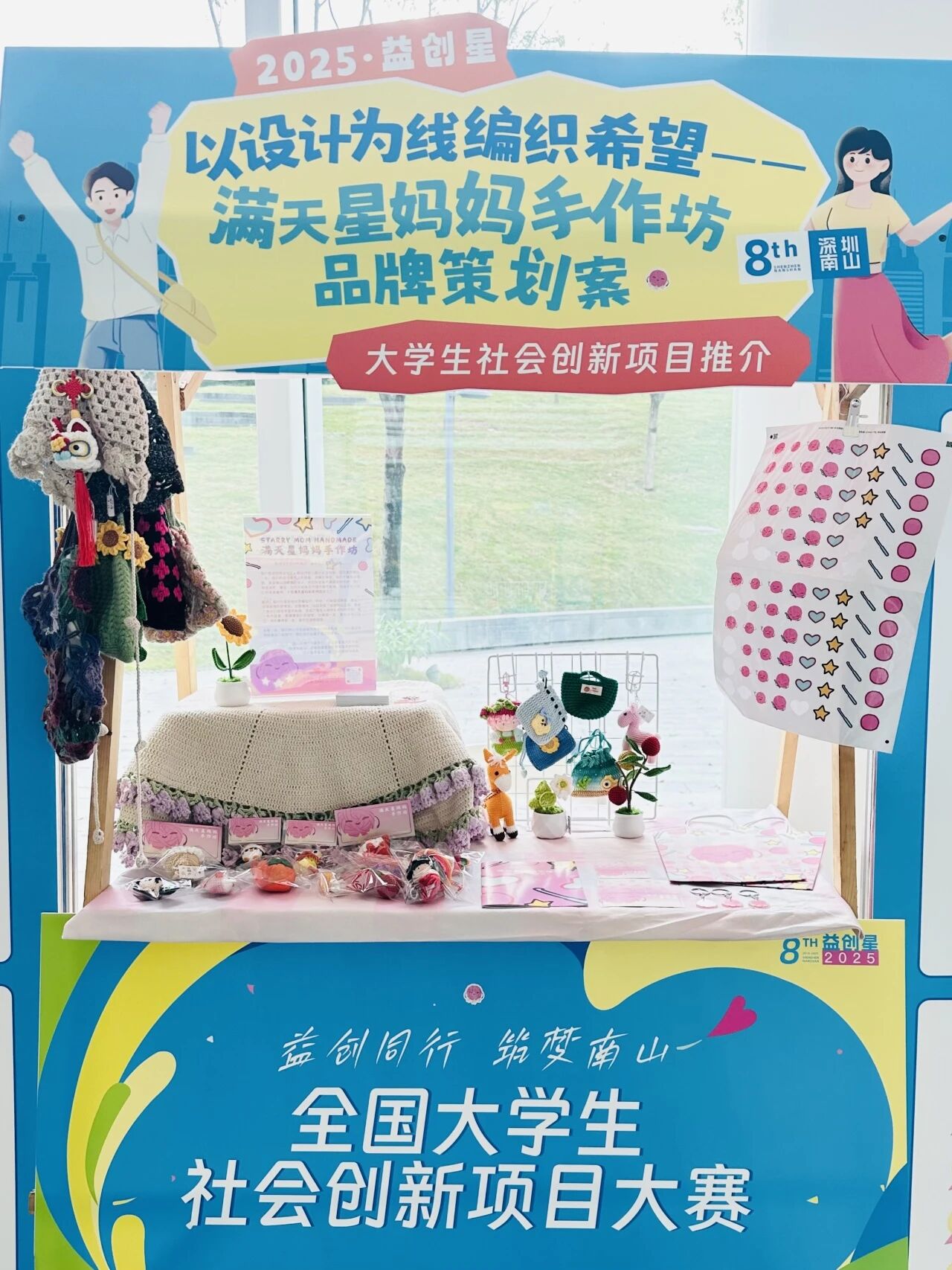 2025年11月15日,“益创星·2025” 深圳市南山区第八届全国大学生社会创新项目大赛决赛圆满落幕。我院创策专业毕业生李依璇、庄颖的“满天星妈妈手作坊品牌策划案”,凭借其创新性和社会价值,一举夺得民生公益赛道铜奖,并斩获最佳人气纪念奖。本次大赛聚焦民生公益与科技创新,吸引了来自全国105所高校的245个项目同台竞技。该获奖项目源于我院创策专业核心课程《社会创新设计》的孵化,后经深化成为落地执行的毕业设计,是学生自主创新能力的生动体现。