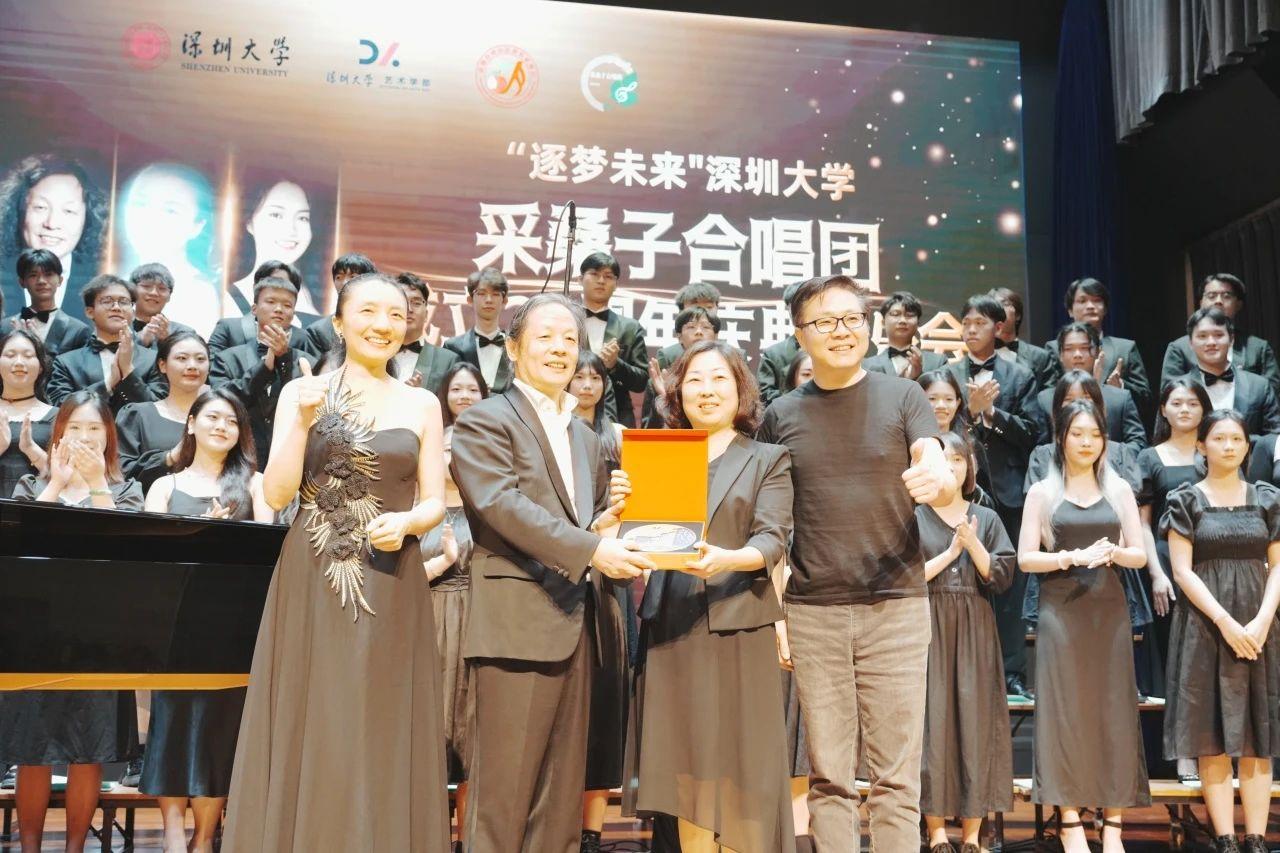 音乐会临近尾声,现场响起了《生日快乐歌》。刘琨院长、周春虎教授两人共同切开蛋糕,并与现场所有师生、校友、嘉宾为20周岁的采桑子合唱团送上美好祝福,祝福采桑子合唱团风华正茂、逐梦未来。最后,刘琨院长为周春虎教授颁发深圳大学荣休纪念章。