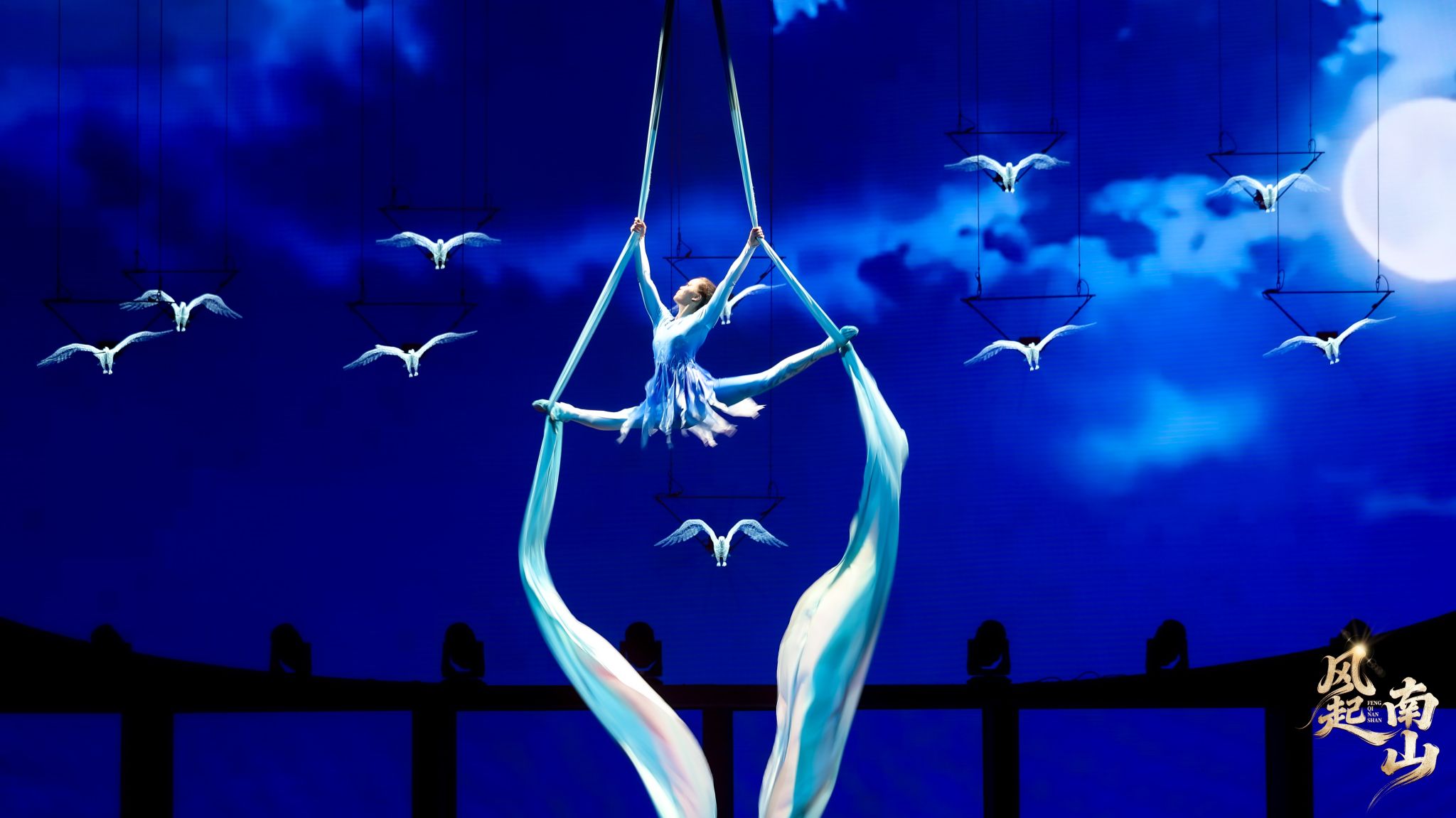 “礁石漫过秦汉月,咸风晒着半渔网”。开场唱段未落,激光投射的鹏鸟穿越时空,将观众带入时光褶皱里。