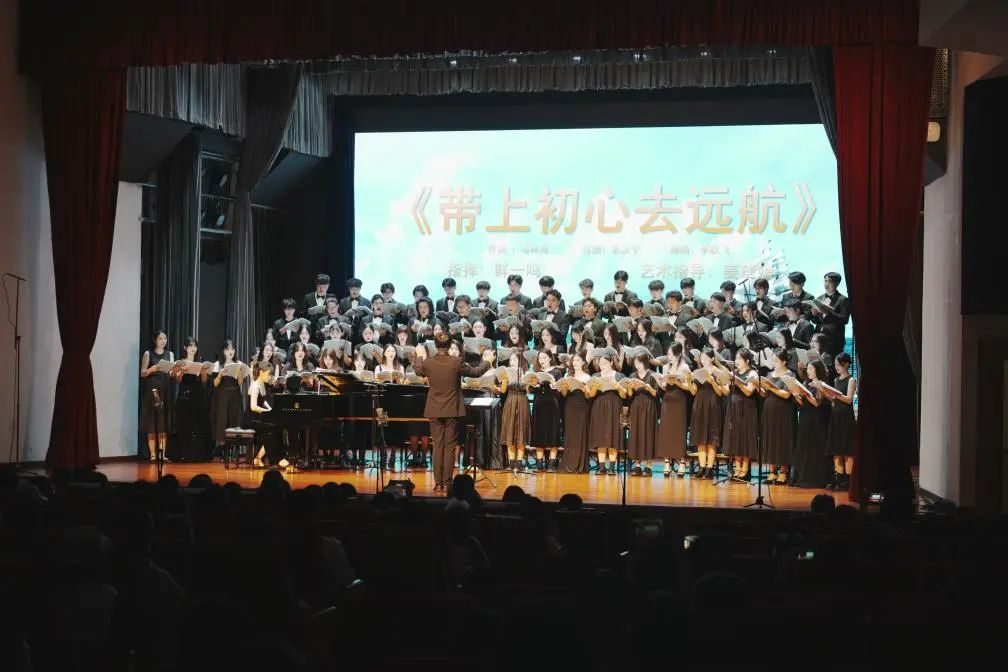 最后一首作品《我和我的祖国》,由声乐教研室主任黄戈副教授领唱、优秀校友胡丹小提琴伴奏,台上百位采桑子合唱团成员和现场观众共同高歌,现场歌声激动人心。