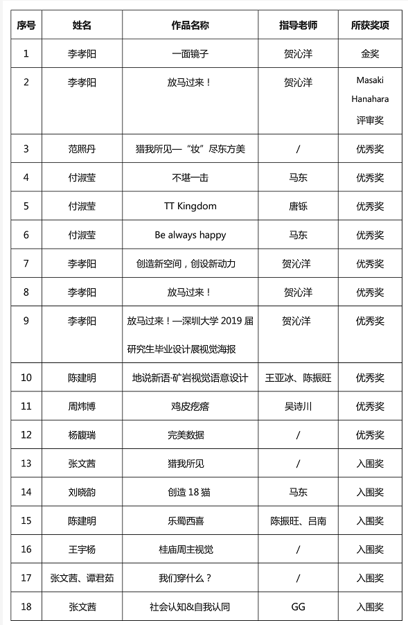本届大赛共收到来自20个国家和地区的12790位参赛者投送的38710件作品,经过评审团严格的评选,共评选出11个类别奖项,其中评审奖18件,全场大奖1件、金奖10件、银奖14件、铜奖22件,优秀及入围奖700余件,最终作品入选率仅为2.16%!美术与设计学院2018级艺术设计研究生(视觉传达设计研究)李孝阳同学的设计作品《一面镜子》、《放马过来》分别荣获金奖、评审奖各1项。