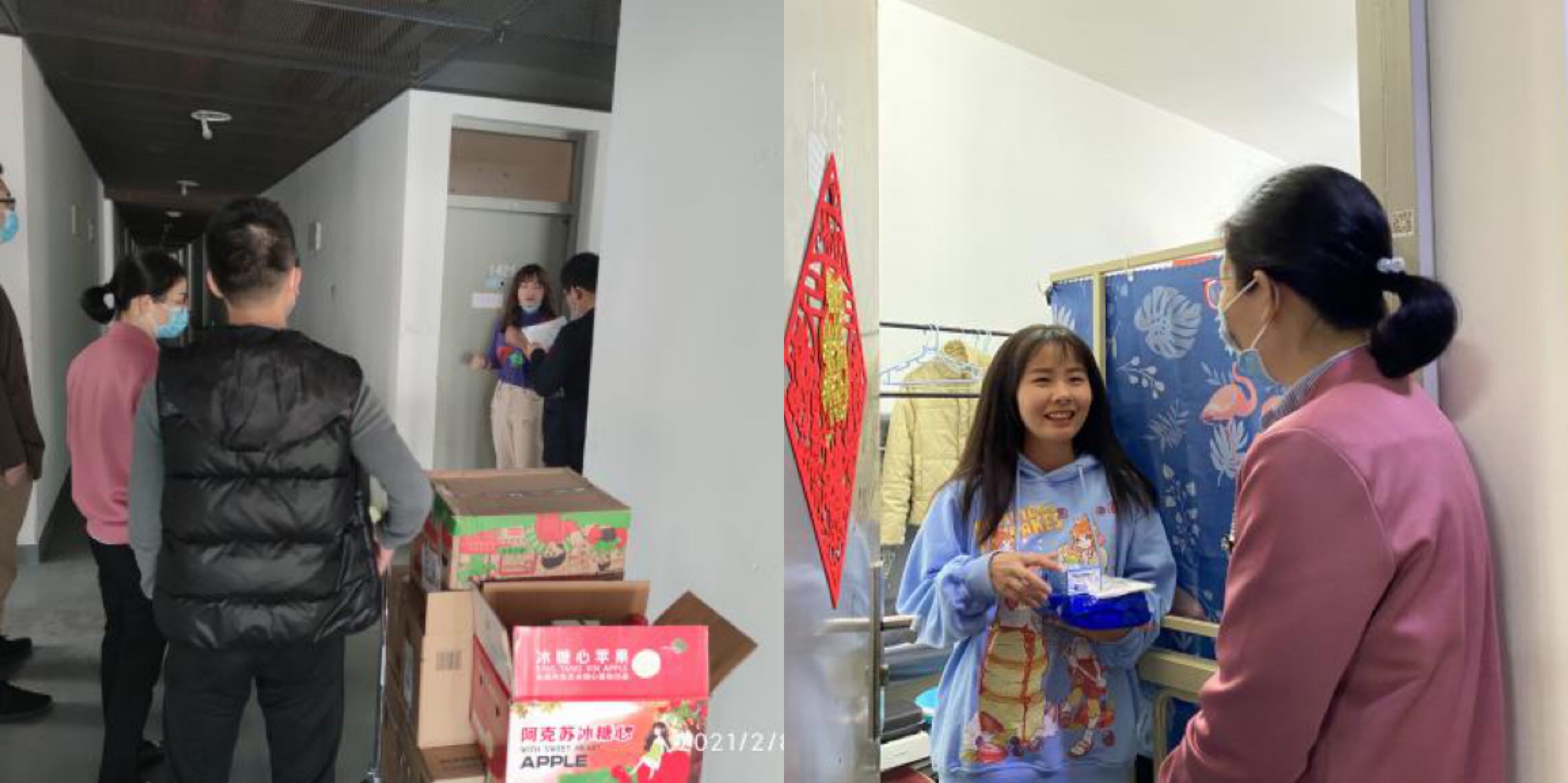 在走访宿舍的过程中,汪渝副书记强调学生留校期间要严格遵守学校的防疫要求,坚持“非必要不出校“的原则,合理安排作息,规划好假期生活;叮嘱同学们要树立安全第一的意识,做好个人日常防护,并主动与家人保持联系,如遇突发问题及时向辅导员老师及学部汇报并寻求帮助;鼓励毕业班同学做好规划,寒假期间认真撰写论文,尽早完成毕业设计相关工作。“新年快乐,牛年大吉,给你拜个早年啦”,最后学部老师们为留校同学送上了新春慰问品、防疫物品及新年祝福,同学们欢欣雀跃、深受感动。