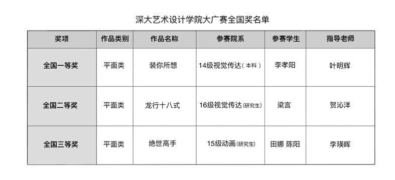 2017年9月16日,第九届全国大学生广告艺术大赛国家级奖项名单公布,在全国数百所高校学生的激烈的竞争中我校艺术设计学院四名同学脱颖而出,分别获得全国一等奖,全国二等奖与全国三等奖。