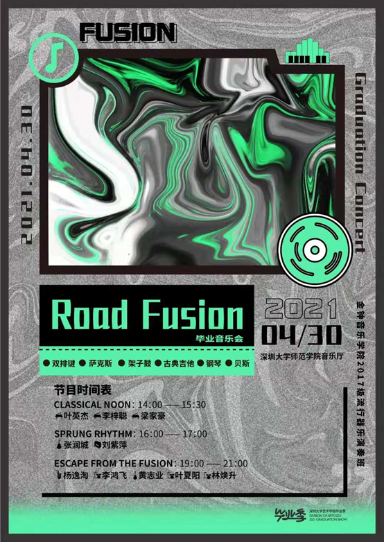 2021深圳大学艺术学部“ENTER毕业季”,展演板块活动之一——2017级金钟流行器乐演奏音乐会《Road Fusion》,将于4月30日在深圳大学师范学院音乐厅启幕开演!