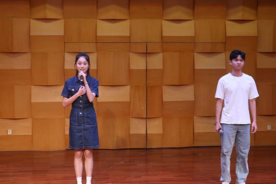 现场展演在全体演员共唱《筑梦殿堂》中活力开场。随后,展演节目在两位“有声推介官”的特别推荐下逐一登台演绎。本次活动特别邀请到了戏剧影视学院副院长兼播音主持系主任陈昕瑜老师、戏剧影视学院表演系张春丽老师、艺术学部团委书记陈贤坤老师担任评委嘉宾,共同评选出现场展演活动的作品等级奖与“时代风貌特别奖”。另外,由现场观众共同推选出“最佳人气作品奖”。
