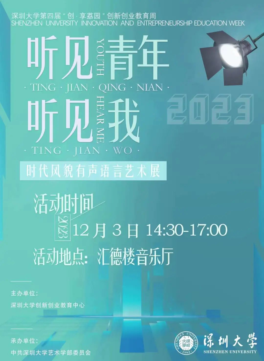 2023年12月3日,由深圳大学创新创业教育中心主办、中共深圳大学艺术学部委员会承办,戏剧影视学院学生党支部策划执行以及戏剧影视学院教工党支部倾情指导的“听见青年,听见我”时代风貌有声语言艺术展在深圳大学汇德楼音乐厅落下帷幕。