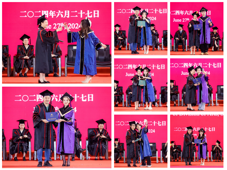 优秀毕业生颁奖环节结束后,紧接着进行艺术学部2024届学位授予仪式,由美术与设计学院院长陈向兵教授、音乐舞蹈学院院长刘琨教授、戏剧影视学院副院长吴熙副教授、戏剧影视学院副院长陈昕瑜副教授逐一为2024届毕业生颁发学位证书,并合影留念。