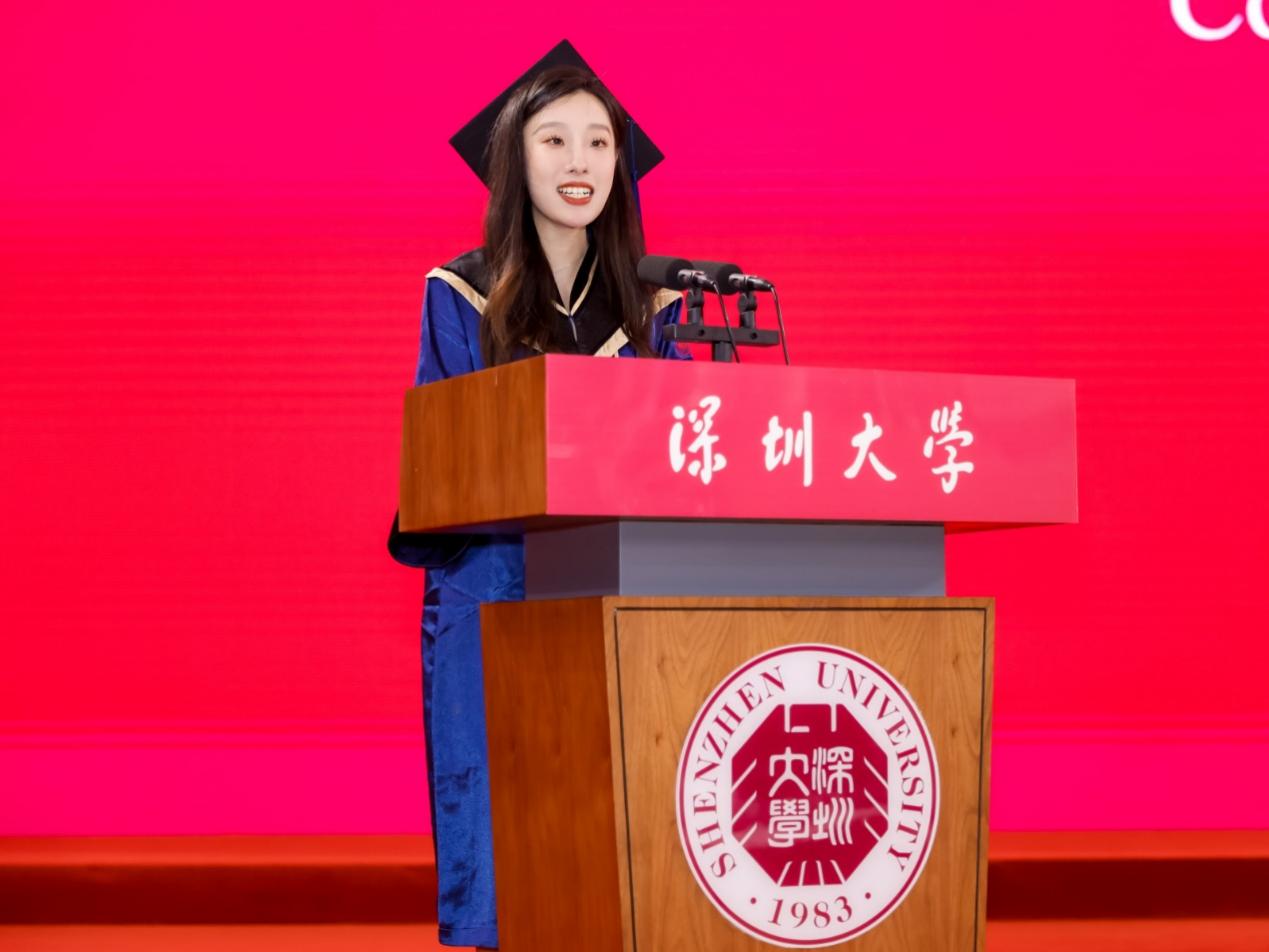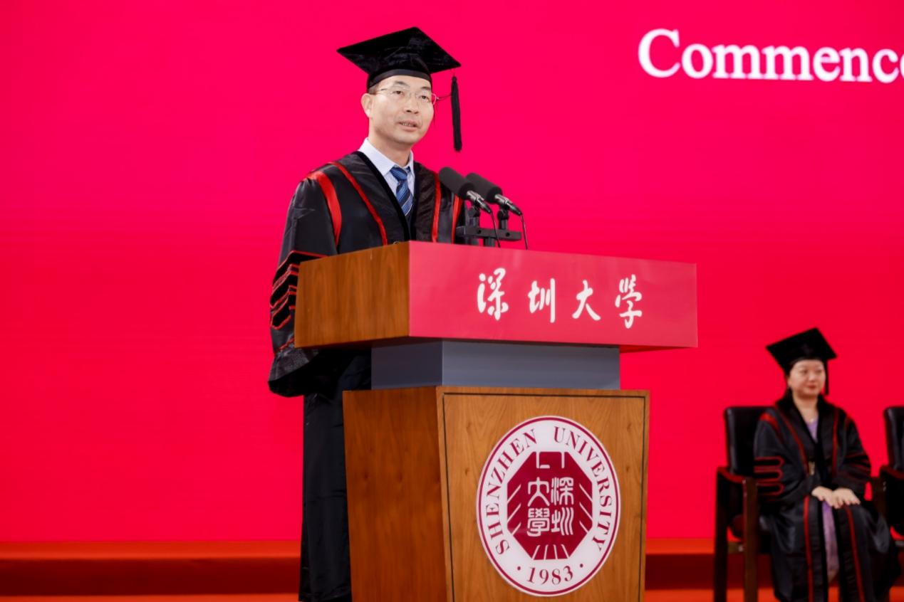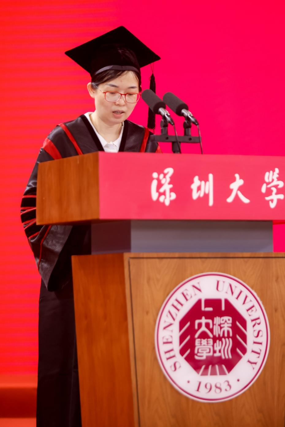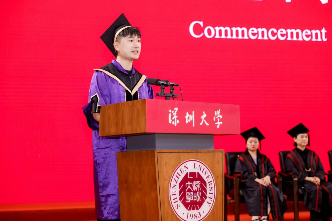 优秀毕业研究生代表饶兆伟同学发言,作为省级样板党支部书记的他,从“奔赴深圳、奔赴深大、奔赴山海”三个维度回顾了这三年难忘的经历,感谢师长一路的指导,也祝福同学们毕业快乐,未来再会。