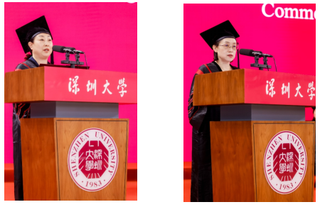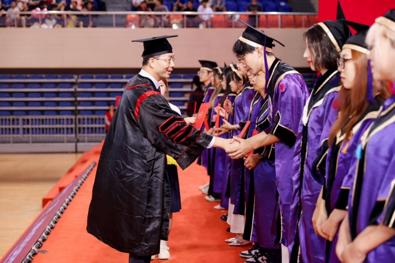 汪渝副书记宣读优秀毕业生表彰决定,希望获奖同学牢记“自立、自律、自强”的深大校训,戒骄戒躁再接再厉,在新的人生征途中取得更优异的成绩。党委书记张剑滨博士为优秀毕业生颁发证书。