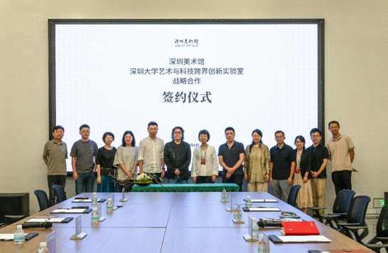 7月4日上午,深圳大学艺术学部副主任、美术与设计学院院长陈向兵教授一行到深圳美术馆(新馆)调研,并参加深圳大学艺术与科技跨界创新实验室与该馆的战略合作签约仪式。深圳美术馆副馆长王新妮(主持工作)、副馆长王子蚺接待。深圳大学艺术学部美术与设计学院副院长王昕、创意策划与设计管理系主任张毅,艺术与科技跨界创新实验室负责人车达,实验室团队成员陈彬副教授、石铁柱副教授;深圳美术馆学术研究部主任覃京侠、公共教育部主任游江、典藏部主任李原原、典藏部副主任王志、学术研究部研究员罗惠菱等各业务相关部门负责人及项目负责人,共同参加了座谈会。会后,深圳大学艺术与科技跨界创新实验室与深圳美术馆签署战略合作协议。