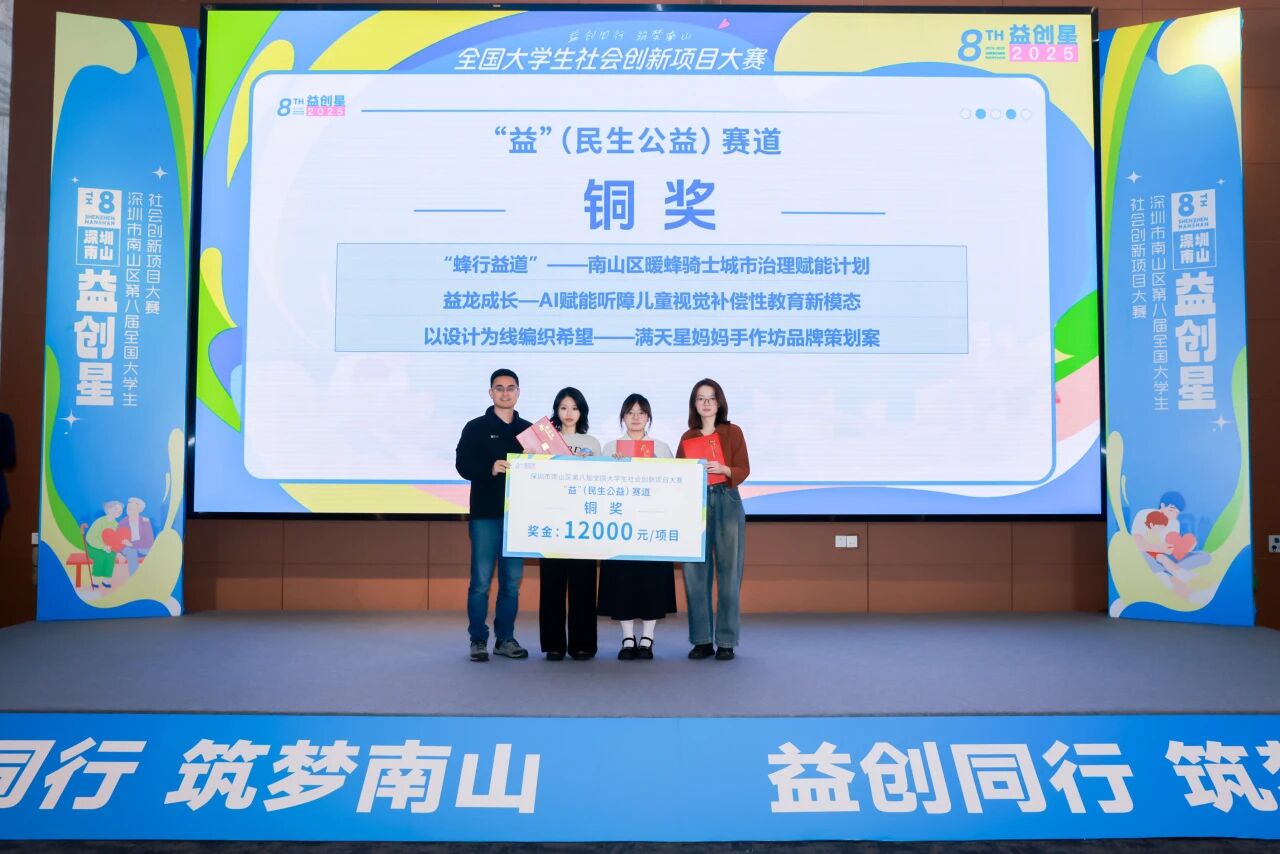 2025年11月15日,“益创星·2025” 深圳市南山区第八届全国大学生社会创新项目大赛决赛圆满落幕。我院创策专业毕业生李依璇、庄颖的“满天星妈妈手作坊品牌策划案”,凭借其创新性和社会价值,一举夺得民生公益赛道铜奖,并斩获最佳人气纪念奖。本次大赛聚焦民生公益与科技创新,吸引了来自全国105所高校的245个项目同台竞技。该获奖项目源于我院创策专业核心课程《社会创新设计》的孵化,后经深化成为落地执行的毕业设计,是学生自主创新能力的生动体现。