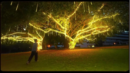 郭元威同学分享了实际落地背后的故事,以场地中的两棵大榕树为例,团队通过对北图书馆场地的考察,融入环境中的两棵大榕树进行微创意的叠加。树,承载了一届又一届深大学子的记忆!两棵灯光树需要消耗多长的灯带?A树与B树有多少条主枝干?多少条分支?每条枝干多少米?灯带间排列的间隙在多少厘米之间呈现出的视觉效果最好………团队成员一遍遍地进行数据测量与预算计算,只为呈现出最好的视觉效果。