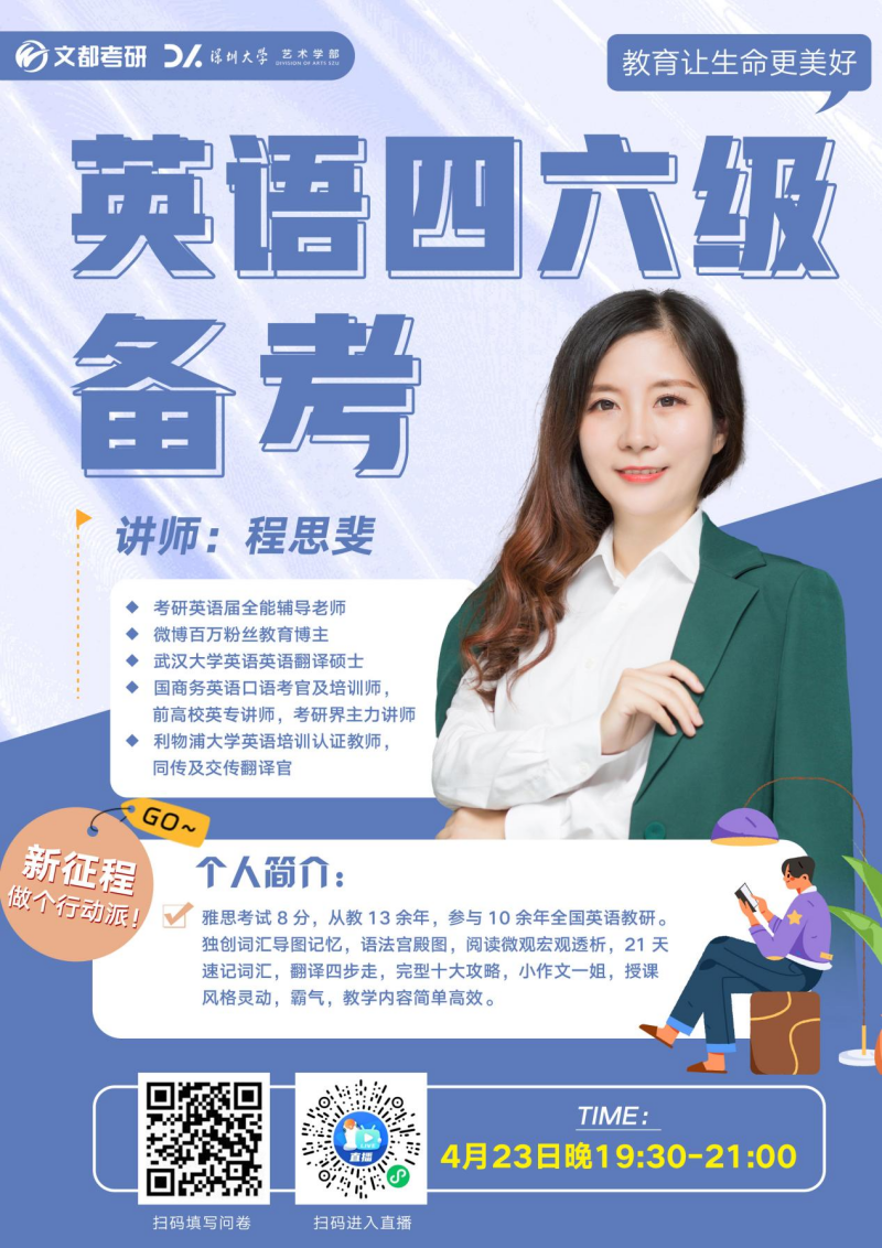 讲座嘉宾:程思斐老师,考研英语届全能辅导老师,微博百万粉丝教育博主,武汉大学英语英语翻译硕士,全国商务英语口语考官及培训师,前高校英专讲师,考研界主力讲师,利物浦大学英语培训认证教师,同传及交传翻译官,雅思考试8分,从教13余年,参与10余年全国英语教研。独创词汇导图记忆,语法宫殿图,阅读微观宏观透析,21天速记词汇,翻译四步走,完型十大攻略,小作文一姐,授课风格灵动,霸气,教学内容简单高效。