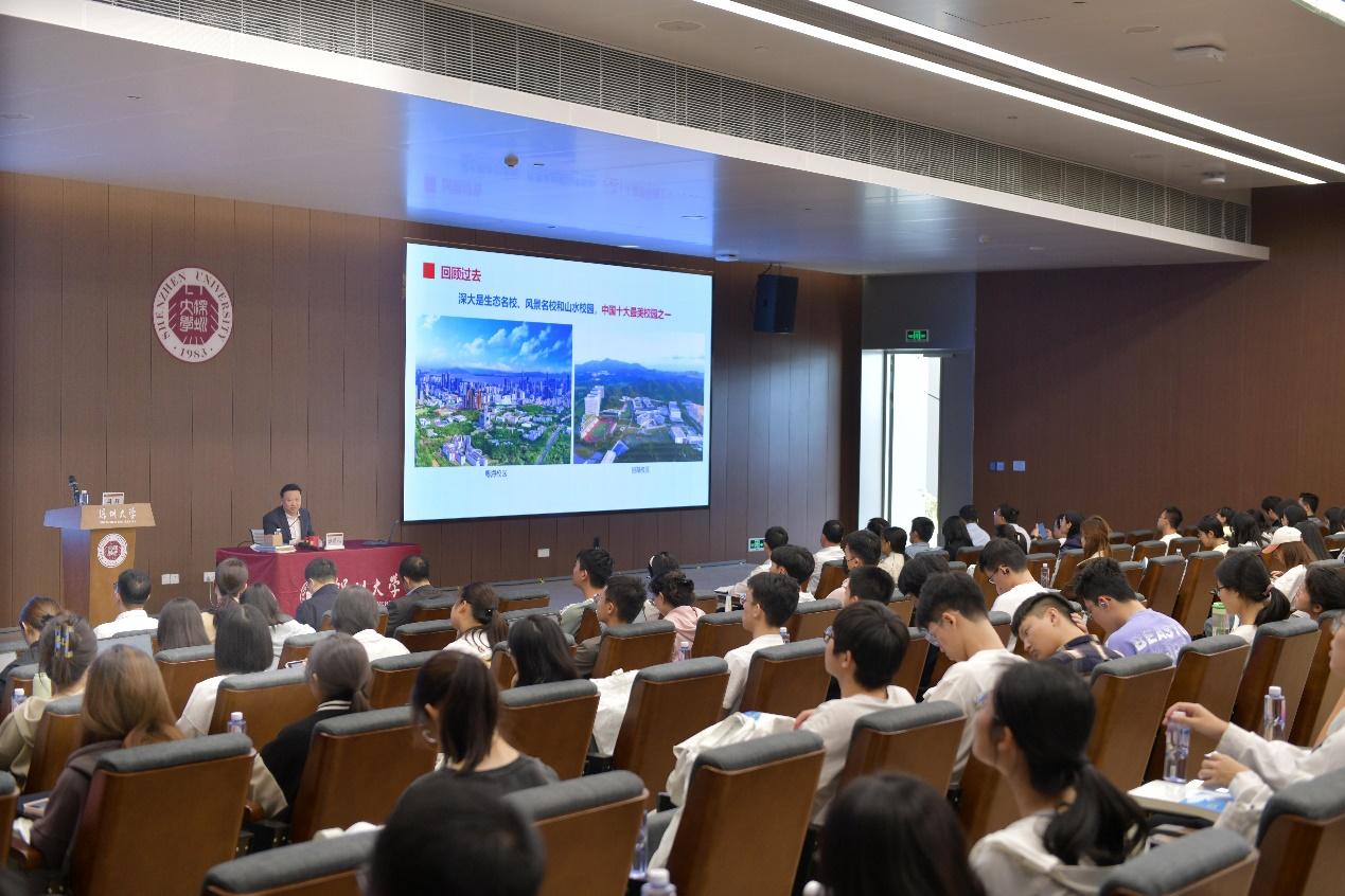11月24日下午,深圳大学丽湖校区中央图书馆报告厅座无虚席。为深入学习贯彻习近平生态文明思想,学校邀请深圳市委委员、市生态环境局党组书记张学凡主讲思政课讲座——“人与自然和谐共生的城市之路——习近平生态文明思想在深圳的生动实践”,以“生态绿”与“思政红”相结合的形式,让学子们感悟新时代青年的责任和使命。200多余位师生到场聆听讲座,深圳大学副校长周辉主持讲座。