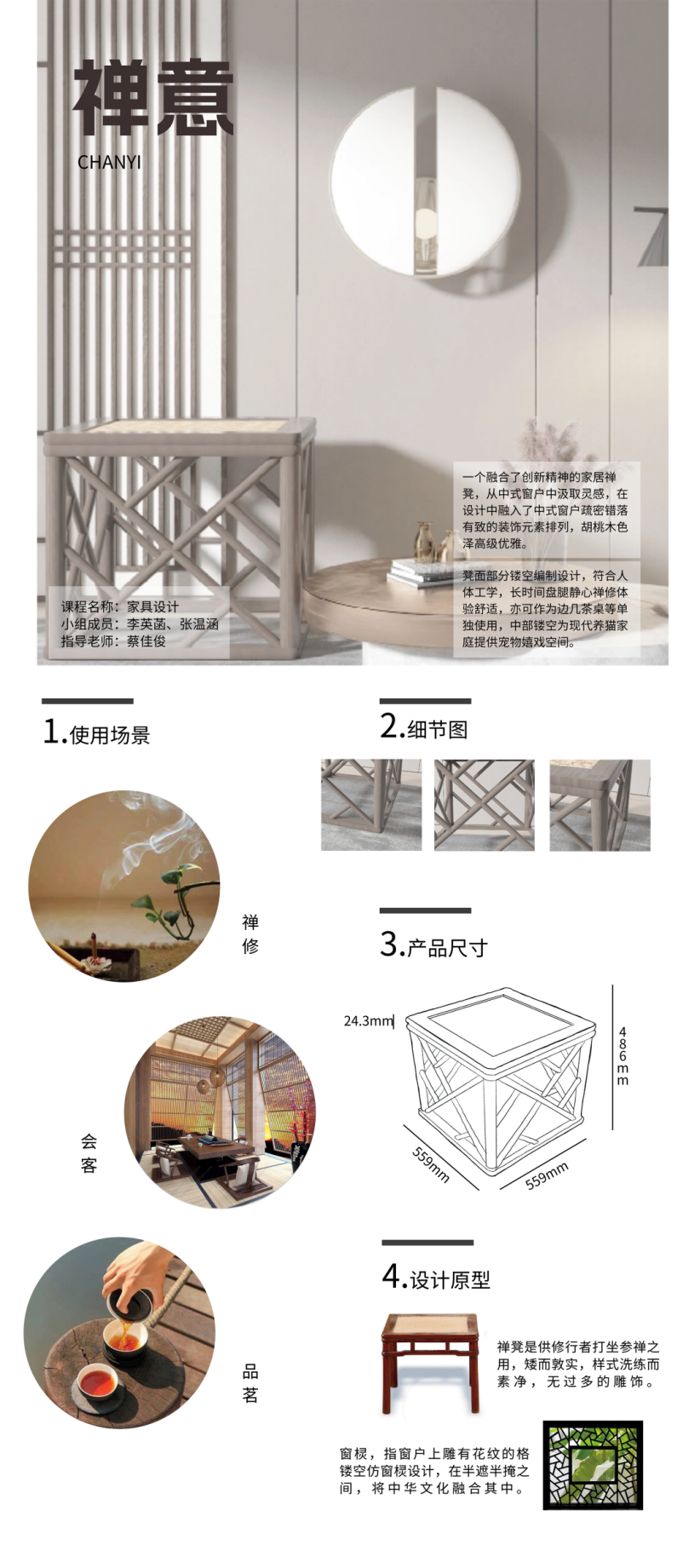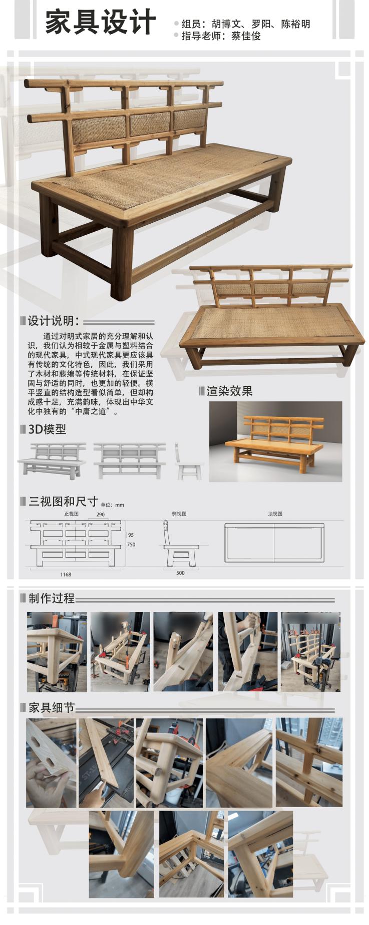 在漫长的文明史上,中国的家具设计有着基于哲学思考并经过历史检验的审美、价值观和艺术追求。尤其是文人风格的明式家具,似乎具有超越个人、民族、地方和时代审美偏好的美学质量,可久可大,历久弥新,似乎具备成为中国式现代家具源头活水的生命力。我们在课程中尝试对其进行探索,并尝试以其为切入点理解其背后的哲学思想,最终,我们尝试把自己所理解的中国式审美、价值观和艺术追求融入现代生活,尝试为中国式现代生活设计中国式现代家具。