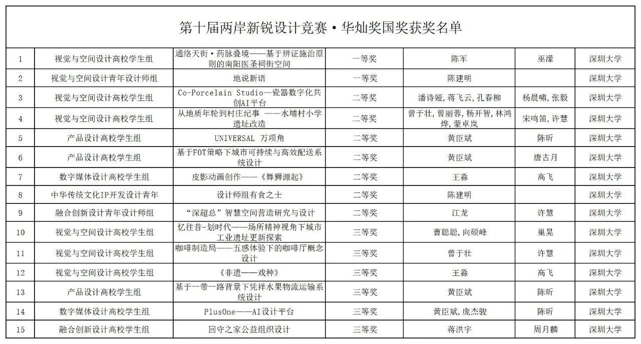 近日,第十届两岸新锐设计竞赛・华灿奖全国总决赛获奖名单正式公布。深圳大学艺术学部美术与设计学院在本次赛事中斩获佳绩,荣获国奖一等奖2项、二等奖7项、三等奖6项,国赛获奖总数位列广东省高校首位。