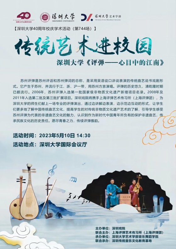深圳戏院将携手上海评弹艺术传习所(上海评弹团),为深圳大学的师生们献上一场专业的评弹演出,通过边讲解边表演,边示范边互动的形式,让学生们更多地了解中国传统曲艺文化,提高学生的对传统非物质文化遗产艺术的了解,引导学生们感受苏州评弹为代表的非遗曲艺文化的魅力,认识到作为新时代中国青年所负有的保护非遗曲艺,传承民族文化的历史责任。愿尽青春之力,传续评弹雅韵。