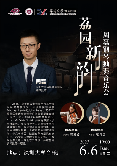 周磊,深圳大学音乐舞蹈学院钢琴专业全职授课教师。2016年获美国波士顿大学音乐学院钢琴演奏家文凭,师从美国钢琴家Michael Lewin和John Perry。2022年获美国堪萨斯大学音乐学院钢琴演奏博士学位,师从美国著名钢琴教育家Dr. Scott McBride Smith, 并在堪萨斯大学担任助教,多次指导学生完成钢琴本科毕业音乐会。曾应邀在美国纽约演出室内乐及钢琴独奏。合作过的乐团有堪萨斯大学交响乐团、陕西省歌舞剧院交响乐团、西安音乐学院交响乐团等。所教学生多人考入专业音乐院校,并在各类钢琴比赛中获奖。