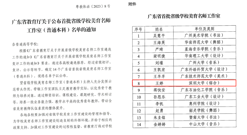 近日,广东省教育厅公布了广东省首批省级学校美育名师工作室(普通本科)名单,深圳大学艺术学部王婷教授主持申报的以语言艺术为核心的传统文化传播推广综合工作室成功获批为首批广东省美育名师工作室。