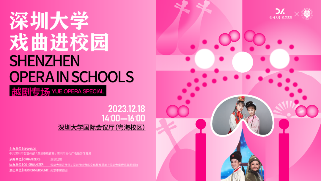 12月18日,“深圳市戏曲进校园”项目将携手南京市越剧团,为深圳大学的师生们献上一场专业经典的越剧选段展示,通过边讲解边表演,边示范边互动的形式,让学生们更多地了解中国地方优秀剧种,不断提高学生的戏曲艺术素养,引导听众从感受戏曲、了解戏曲,到欣赏戏曲、喜爱戏曲,力求把中国传统文化“种”进学生心里,开出绚丽的戏曲之花。