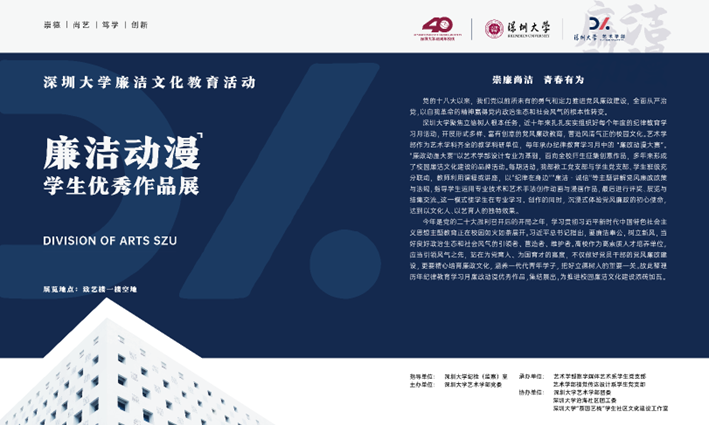 为发挥优秀作品的教育宣传作用,助力校园廉洁文化建设,营造风清气正的校园文化,让校内师生沉浸式体验优秀作品的魅力,艺术学部组织举办了 “崇尚廉洁,青春有为”廉洁动漫学生优秀作品展,将过去历年来优秀作品集结展出。
