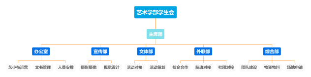 艺术学部学生会由3名主席团成员与办公室、宣传部、文体部、外联部、综合部共五个部门的18位总干事组成。