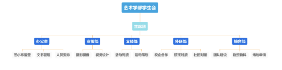艺术学部学生会由3名主席团成员与办公室、宣传部、文体部、外联部、综合部共五个部门的16位总干事组成。